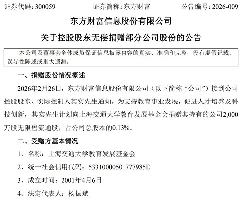 2月27日,東方財富信息股份有限公司(簡稱“東方財富”)發(fā)布關(guān)于控股股東無償捐贈部分公司股份的公告。公告稱,2月26日,東方財富信息股份有限公司接到公司控股股東、實際控制人其實通知,為支持教育事業(yè)發(fā)展,促進人才培養(yǎng)及科技創(chuàng)新,其實計劃向上海交通大學(xué)教育發(fā)展基金會捐贈其持有的公司2000萬股無限售流通股,占公司總股本的0.13%。