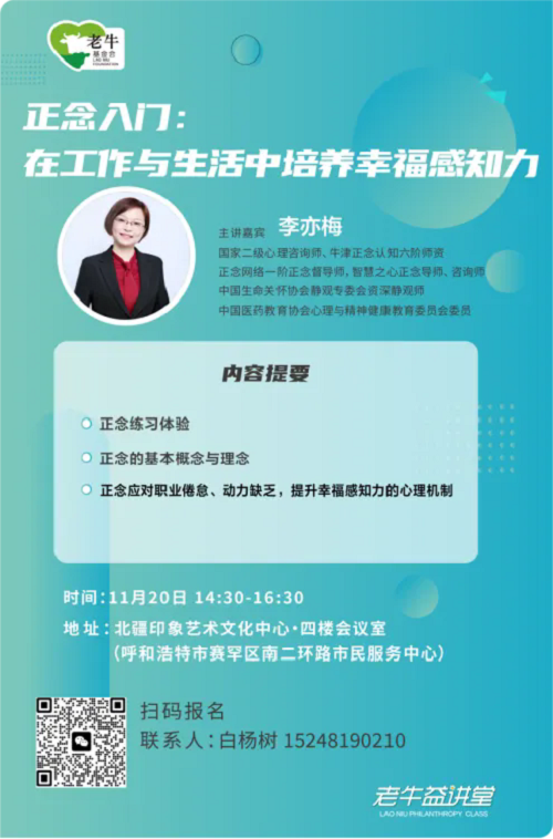 11月20日(周三)下午,第33期老牛益講堂將在呼和浩特市北疆印象藝術(shù)文化中心(四樓會(huì)議室)舉辦,主題為“正念入門:在工作與生活中培養(yǎng)幸福感知力”。