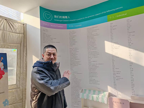 嫣然天使兒童醫(yī)院一樓,李亞鵬在“我們的捐贈人”墻下介紹醫(yī)院的誕生歷程(趙明鑫/攝)