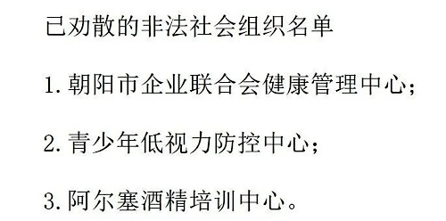 根據(jù)省、市相關(guān)工作部署,遼寧省朝陽市雙塔區(qū)民政局深入推進(jìn)打擊整治非法社會組織專項(xiàng)行動,依法查處并勸散了一批非法社會組織,包括朝陽市企業(yè)聯(lián)合會健康管理中心、青少年低視力防控中心、阿爾塞酒精培訓(xùn)中心。
