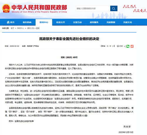 2月2日,民政部發(fā)布了《民政部關于表彰全國先進社會組織的決定》。根據《民政部關于開展第五次“全國先進社會組織”評比表彰活動的通知》要求,經推薦申報、資格審查、專家評審、征求意見、社會公示等程序,民政部授予286個社會團體、社會服務機構和基金會“全國先進社會組織”稱號。其中,中國殘疾人福利基金會憑借40多載深耕助殘公益的卓越成效與責任擔當榮獲表彰。