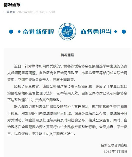 1月18日,“寧夏商務”微信公眾號就此發(fā)布情況通報。通報稱,針對媒體和網(wǎng)民反映的寧夏餐飲飯店協(xié)會在換屆選舉中出現(xiàn)的負責人超額配置等問題,自治區(qū)商務廳會同民政廳、市場監(jiān)管廳等部門成立了聯(lián)合調(diào)查組,并約談了協(xié)會負責人,開展全面調(diào)查。