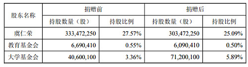 截至公告披露日,虞仁榮持有公司股份333472250股,占公司目前總股本的27.57%;公司股東教育基金會持有公司股份6690410股,占公司目前總股本的0.55%。此次捐贈后,虞仁榮持股比例降至25.09%,教育基金會持股比例降至0.50%,大學基金會持股比例升至5.89%。