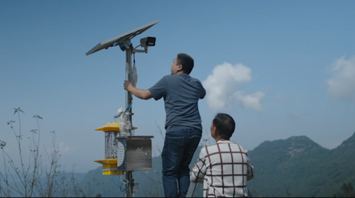 農(nóng)場(chǎng)負(fù)責(zé)人蔡青松和村民一起調(diào)整海康威視的設(shè)備