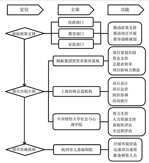 四是項目形成了證監(jiān)、教育及民政等政府部門,學術機構、社會組織和企業(yè)等多方協(xié)同參與的公益合作生態(tài)。教育及民政部門提供政策空間和落地支持,為項目實施和推廣創(chuàng)造了條件;學術機構,如中央財經(jīng)大學社會與心理學院,負責智力支持和成效監(jiān)測,確保項目的科學性與有效性;社會組織上海佰特公益負責項目設計、資源整合和執(zhí)行落地,推動項目在福利院的有效實施;企業(yè)方螞蟻集團投資者教育基地,不僅提供資金支持,還派出志愿者參與項目。螞蟻集團的公益社團成員以及螞蟻基金的理財師以志愿者身份積極參與進來,他們具備豐富的市場經(jīng)驗和專業(yè)知識,在項目各個階段發(fā)揮了關鍵作用,為兒童提供了專業(yè)的金融知識和實踐指導,由此形成項目資源生態(tài)網(wǎng)絡圖(見圖)。