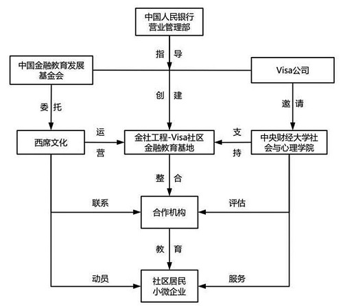 基地探索開創(chuàng)了共建、共創(chuàng)、共享、共贏的社區(qū)金融教育路徑。具體來說:在中國人民銀行營業(yè)管理部指導(dǎo)和授牌下,中國金融教育發(fā)展基金會與Visa公司聯(lián)合發(fā)起、創(chuàng)建;中央財經(jīng)大學(xué)社會與心理學(xué)院作為智力支持方,開展項目監(jiān)測評估和社會工作服務(wù)等;受定向委托的項目運營方承擔(dān)聯(lián)系合作機構(gòu)和動員教育對象職能;基地則通過整合資源網(wǎng)絡(luò),面向社區(qū)居民和小微企業(yè)開展普惠金融教育?;氐闹饕卣魇牵河烧缙笮=鹁佣嘣黧w協(xié)同共建,順利打通了自上而下的社區(qū)為本金融教育路徑,共同創(chuàng)建了項目化“搭臺”與金融機構(gòu)“唱戲”的社區(qū)普惠金融教育生態(tài)樞紐,進而實現(xiàn)了服務(wù)共贏的項目效果,打造形成了社區(qū)金融教育新標桿和金融為民新范式(基地運行模式見圖)。